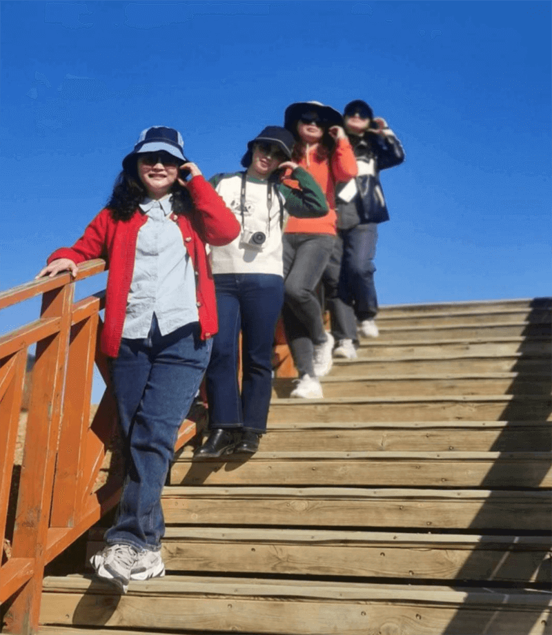 ↑集團高管楊華女士和員工在五彩灘合影留念