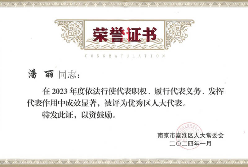 潘麗女士當(dāng)選區(qū)人大代表以來,始終堅(jiān)持"人民選我當(dāng)代表,我當(dāng)代表為人民"的信念,作為一名民營企業(yè)家,始終堅(jiān)持"為社會創(chuàng)造價值,為客戶提供服務(wù),為員工謀求福祉"的企業(yè)價值觀,以高度的責(zé)任感和敬業(yè)精神,勇于挑戰(zhàn),開拓創(chuàng)新。在本屆會議上再次被評為“優(yōu)秀區(qū)人大代表”。