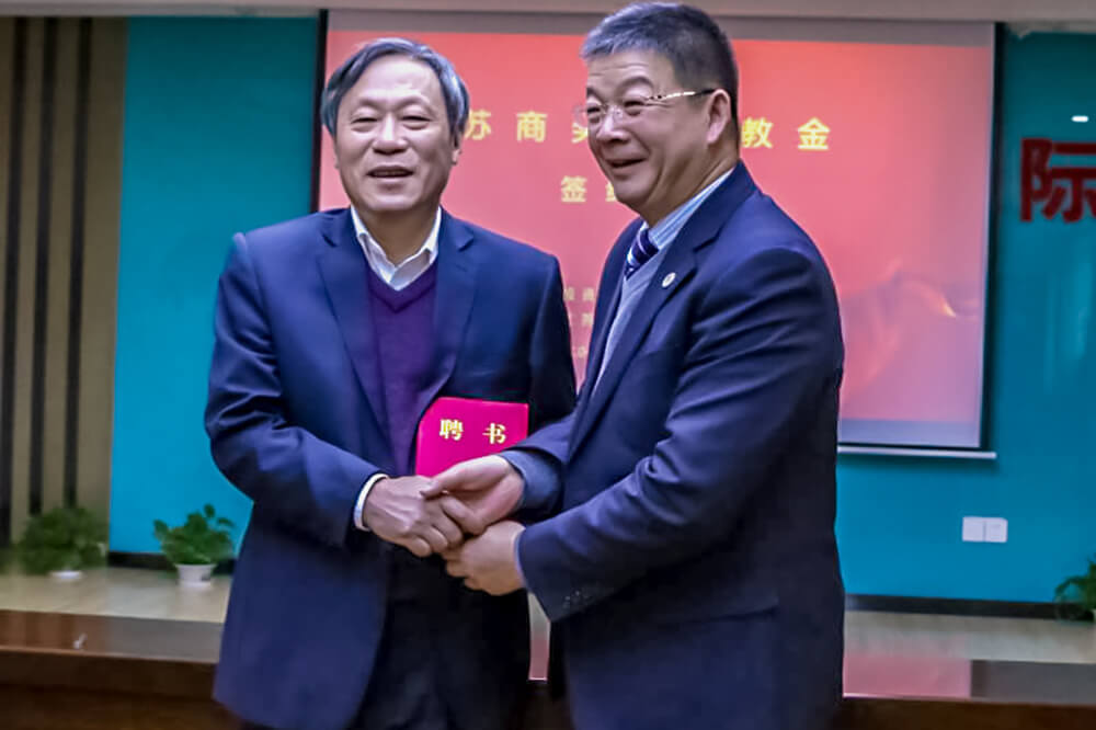 儀式上江蘇商貿(mào)職業(yè)學(xué)院正式聘請(qǐng)陳家俊董事長(zhǎng)為客座教授,并頒發(fā)了聘書(shū)。