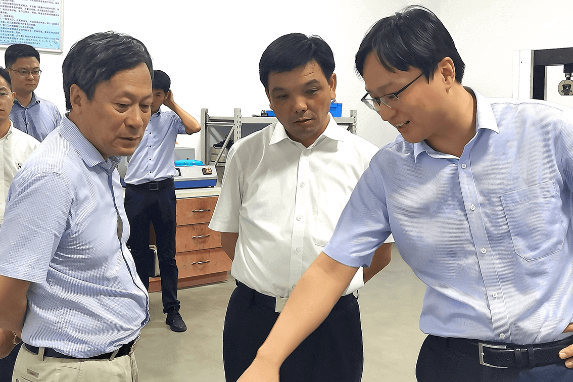 ↑蘇商集團陳家俊董事長(左)和副總經(jīng)理陳寅同志(右)陪同南京江寧濱江開發(fā)區(qū)黨工委萬振華書記(中)參觀南京金城軌道公司產(chǎn)品實驗室。